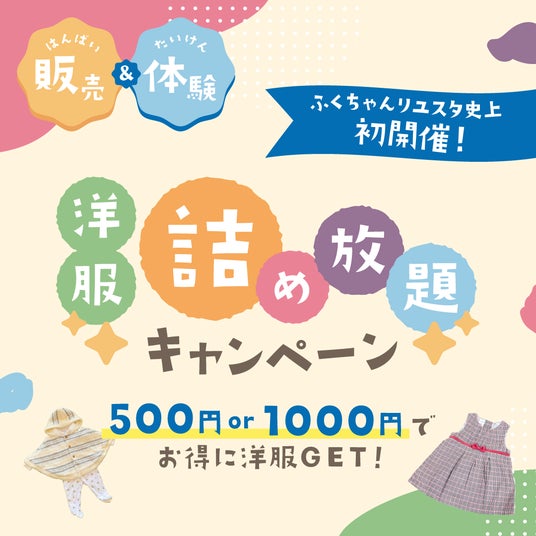 ■洋服詰め放題キャンペーン(「ふくちゃんリユスタ」初)500円または1,000円の袋をご購入いただき、その袋に入るだけ洋服を詰めることができる、大変お得なキャンペーンです。ルールは「持ち手に指が1本でも入ればOK」ととてもシンプル。ぜひご家族でご参加ください。