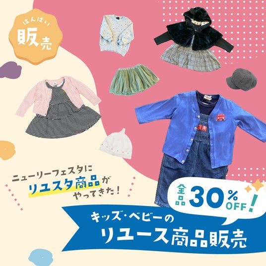 ■キッズ・ベビーのリユース商品ポップアップストア(初開催)ニューリーフェスタでは初めての出店となる、キッズ・ベビーのリユース商品を特別価格で販売するポップアップストアです。こども服など、成長に合わせたアイテムを多数取り揃えており、全品30%OFFとお得な価格でお求めいただけます。