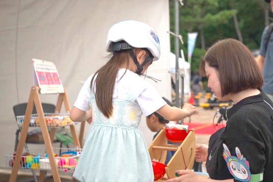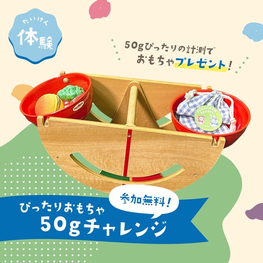 ■ピッタリおもちゃ50gチャレンジ昨年の人気企画を今年も開催!「ふくちゃんリユスタ」実店舗で好評の「おもちゃの量り売り」をモデルにした無料体験ブースです。片方に50gのおもりを乗せたてんびんのもう片方に好きなおもちゃを乗せ、ピッタリにできればそのおもちゃと「ふくちゃんリユスタ」公式キャラクター「りゆん&てすた」のお面をプレゼントします。