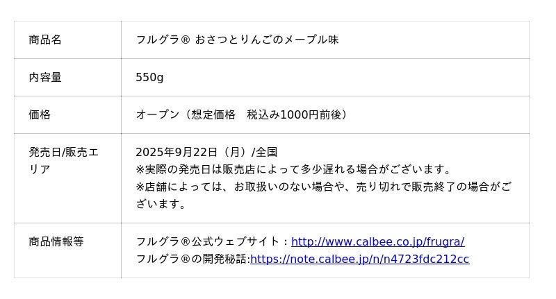 カルビー株式会社(本社:東京都千代田区、代表取締役社長兼CEO:江原 信)は、シリアルブランド売上No.1(※1)の「フルグラ(R)」から、カルビーかいつかスイートポテト株式会社のさつまいもである、オリジナルブランド「紅天使」を初めて使用した秋冬の定番商品『フルグラ(R) おさつとりんごのメープル味』を2025年9月22日(月)より全国で期間限定発売します。(2026年1月中旬終売予定)