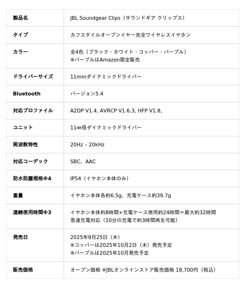 「JBL Soundgear Clips」は、「JBL OpenSoundテクノロジー」により音漏れを最小限に軽減することでプライバシーを守りつつ、周囲のサウンドを逃すことなく取り入れます。また、最大の特長でもある角度をつけたJBL独自設計のアーチ部分「JBL SonicArc」を採用し、どんな耳の形にもフィットする形状で長時間使用でも快適に装着が可能。耳輪などの厚みや形の違いで装着位置が変わっても最適にフィットするため、アクセサリーや眼鏡を装着したままでも変わらず高い装着性を実現いたします。さらに、メカニカル感とエレガントな印象が融合するJBLの中でも人気の高いスケルトンデザインを本モデルにも採用。「ブラック」、「ホワイト」、そして銅を意味する「コッパー」に加え、Amazonにて限定販売される「パープル」の4色のラインアップでさりげない美しさを追求し、おしゃれも音楽も同時にお楽しみいただけます。