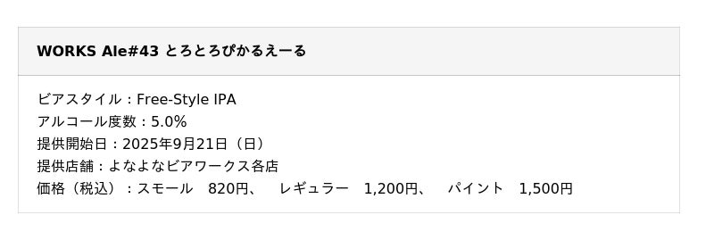 「WORKS Ale」は、よなよなビアワークスが毎回異なるスタイルでお届けする、数量限定のオリジナルビールシリーズです。ビールの本場・アメリカのトレンドや、日本では珍しいスタイルにも挑戦しています。今回は第43弾として、「とろとろぴかるえーる」が登場します。 醸造タンク1本分のみの超限定生産で、都内6店舗のよなよなビアワークスでのみ提供されます。