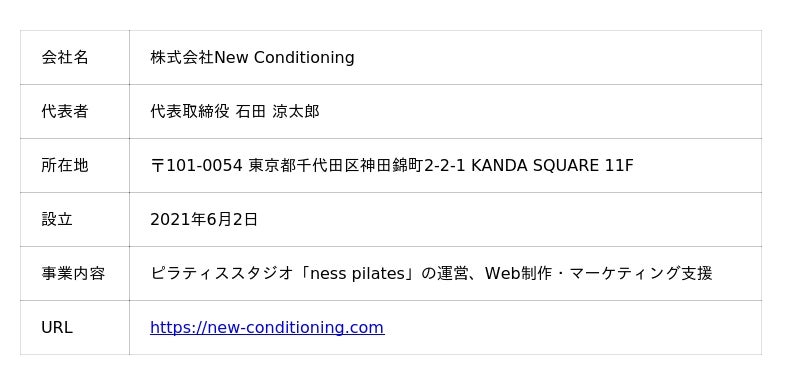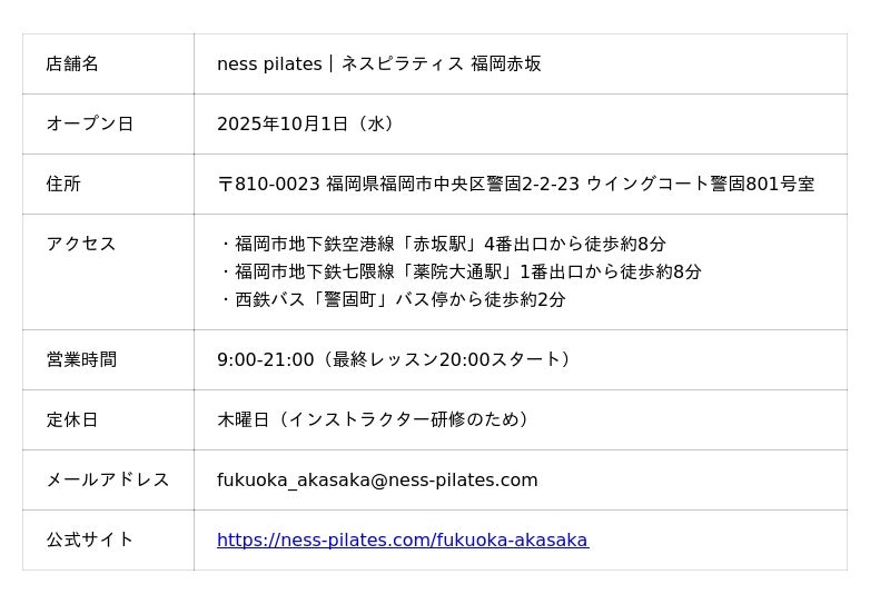 株式会社New Conditioning(所在地:東京都千代田区神田錦町2-2-1 KANDA SQUARE 11F、代表取締役:石田涼太郎)は、整体とマシンピラティスを組み合わせたパーソナル専門ピラティススタジオ「ness pilates(ネスピラティス)福岡赤坂店」を2025年10月1日にグランドオープンいたします。ビジネスと洗練されたライフスタイルが共存する福岡市中央区赤坂エリアで、身体の根本改善を目指す本物志向の方に向けたウェルネス体験を提供します。