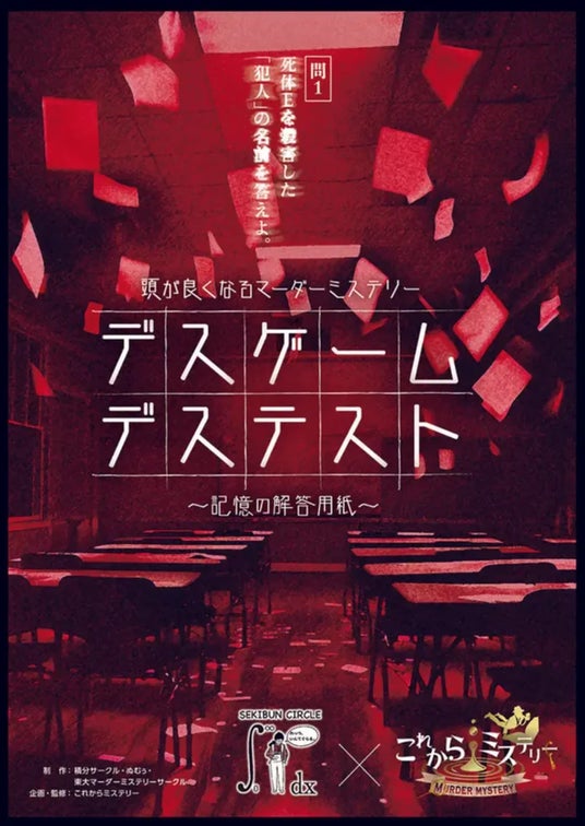 「デスゲームデステスト」問1、死体Eを殺害した犯人の名前を答えよ。――記憶を無くして校舎に閉じ込められた生徒たち4人に、謎のテストが突きつけられます。阪大×東大の頭脳集団による頭が良くなるマーダーミステリーです。