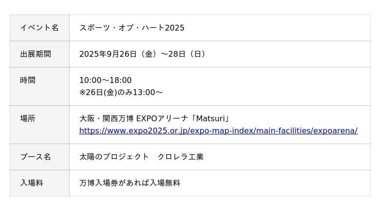 大阪・関西万博内、EXPOアリーナで開催される「スポーツ・オブ・ハート2025」に、「太陽のプロジェクト」との協賛でクロレラ工業のブース出展が決定しました!