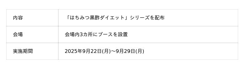 また開催期間中は、出場選手および会場に訪れる来賓の方々を対象とした、「はちみつ黒酢ダイエット」シリーズのサンプリングを実施します。