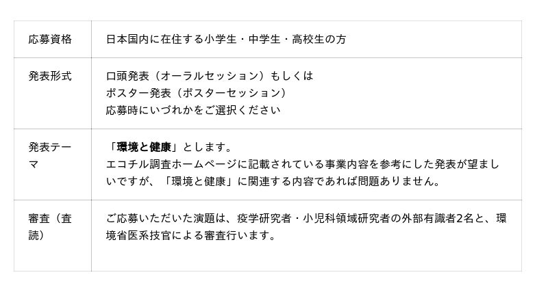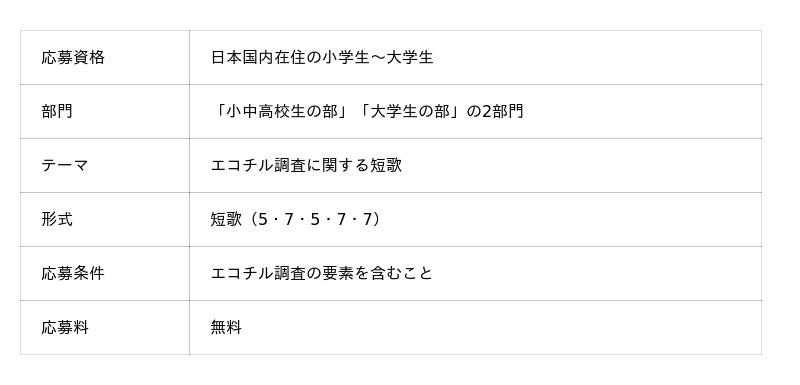 「子どもの健康と環境に関する全国調査(エコチル調査)」をテーマに、全国の小学生・中学生・高校生・大学生から短歌作品を募集します。協力団体による審査の結果、入賞作品は「エコチル調査全国フォーラム」の会場(東京大学 伊藤国際学術研究センター)にて展示されます。