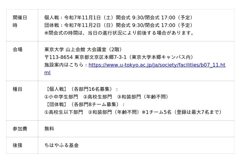 ◆参加部門 個人戦3部門(和装部門(年齢不問)、高校生部門、小中学生部門)