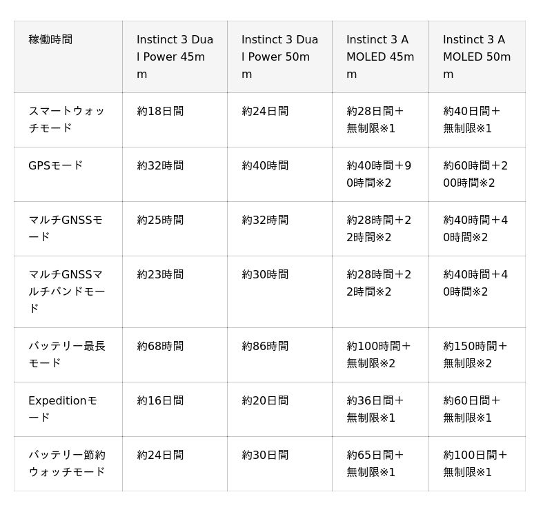 ・Dual PowerモデルはGarminの新しい第3世代ソーラー充電技術の採用で、充電効率・吸収率が大幅に向上。50mmディスプレイモデルの場合、GPSモードでバッテリー約60時間に加えソーラー充電で約200時間※と無限大のバッテリー性能を実現しています。ソーラー充電パネルの進化とモノクロMIPディスプレイも反射と透過のコントラスト比の改善により、視認性が非常に良いのも特徴。