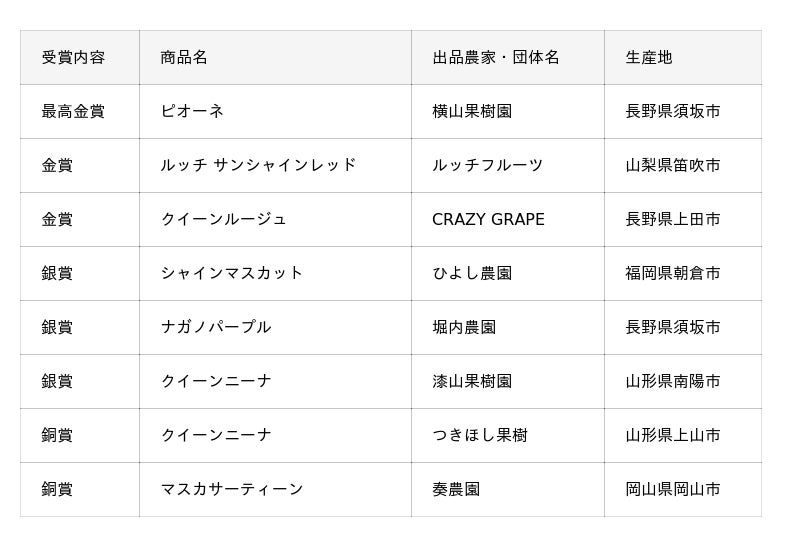 一般社団法人日本野菜ソムリエ協会(所在地:東京都中央区、代表理事:福井栄治)は、2025年9月17日(水)に、野菜ソムリエが選ぶ、もっともおいしい『ぶどう』NO.1を決定する「第2回 全国ぶどう選手権」(以下、本選手権)を開催しました。本選手権では全国各地の産地から届いた62品のぶどうを評価員である野菜ソムリエが産地や品種、生産者などの情報をすべて伏せて食味。そのおいしさを審査し、もっともおいしい「ぶどう」を決定しました。審査の結果、最高金賞には長野県須坂市 横山果樹園が出品した「ピオーネ」が輝きました。