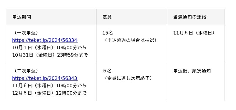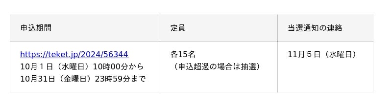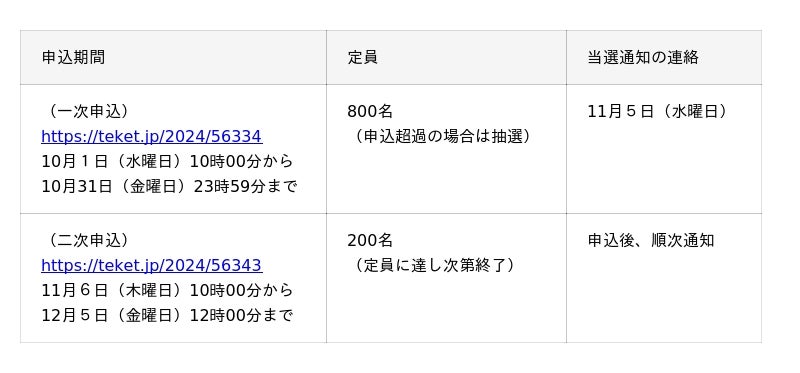10月31日(金曜日)必着です。当選・落選の通知は11月5日(水曜日)に発送します。
