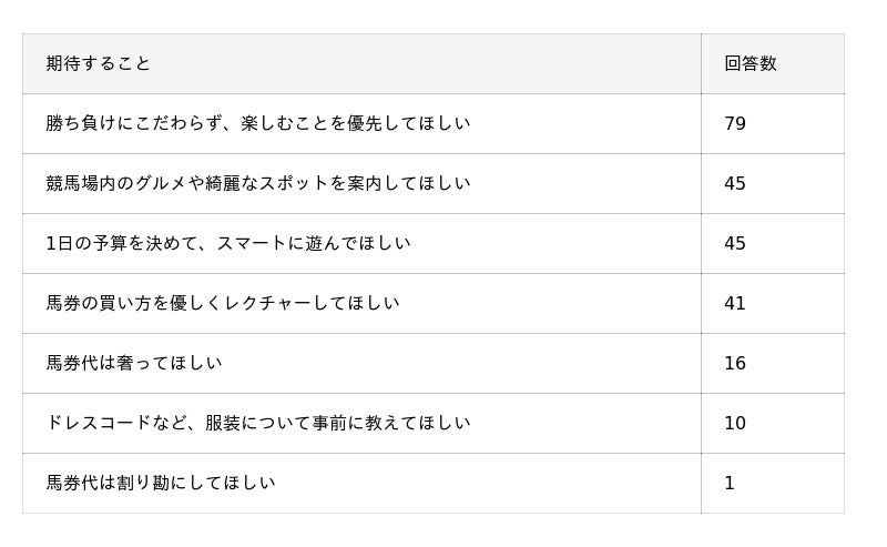 競馬デートに求めるもので圧倒的に多かったのは、「勝ち負けにこだわらず楽しむことを優先して欲しい」でした。