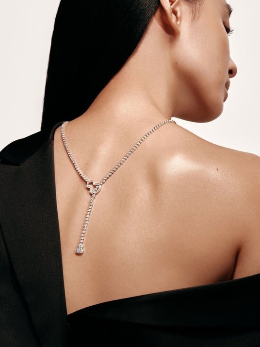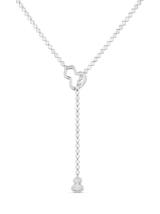 18Kホワイトゴールドに7.18カラットのブリリアントカットダイヤモンドを贅沢に配した“ Wulu Tie ”ネックレス。トロンプ・ルイユを思わせるパヴェの煌めきと精緻な面取り加工により、まるで光そのものを纏うかのような存在感を生み出します。完全可動式のベゼルセッティングは、しなやかな流れを描き、卓越した柔軟性と心地よい装着感をもたらします。さらに、隠し留め金がシームレスで洗練された仕上がりを叶えます。