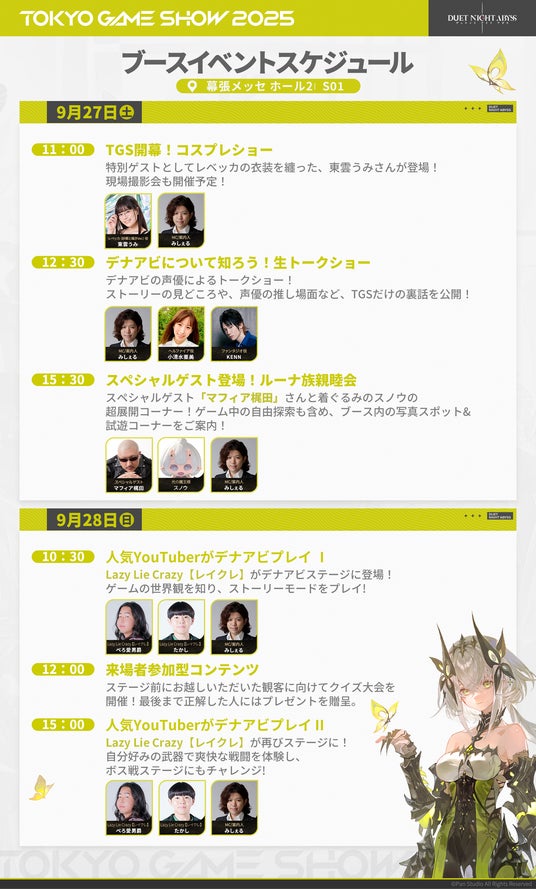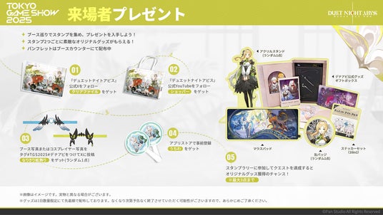 『デュエットナイトアビス』ブースでは、ゲームの世界観を反映したブース装飾、等身大ジオラマ展示をはじめ、声優生トークショー、スペシャルゲストが登場するステージイベントや来場者参加型コンテンツなど、盛りだくさんのイベントを開催いたします。また、TGS会場でしか手に入らない限定ノベルティの配布も予定しております。
