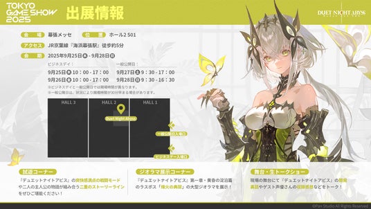 『デュエットナイトアビス』は、2025年9月25日(木)~9月28日(日)に千葉・幕張メッセにて開催される「東京ゲームショウ2025」に出展予定です。今回は、ブースの見どころを一足先にご紹介します。