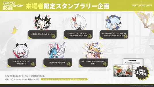さらに、ブース内でスタンプラリーにご参加いただき、すべてての任務を達成すると、ノベルティグッズが100%当たる「スクラッチカード」 に挑戦可能!SNSへの投稿やゲーム試遊など、楽しみながら挑戦できる内容となっています。数量限定のグッズも多数ご用意していますので、ぜひお早めにブースへお越しください!