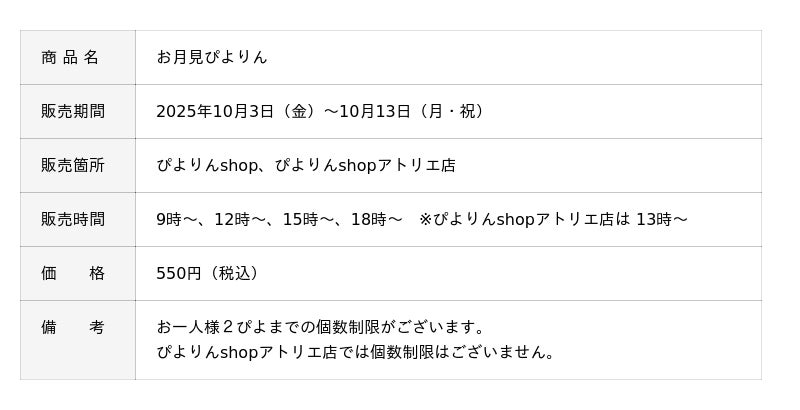 ジェイアール東海フードサービス株式会社(本社:愛知県名古屋市、代表取締役社長:岩下賢一)は、人気スイーツ「ぴよりん」の季節限定商品「お月見ぴよりん」を、2025年10月3日(金)~10月13日(月・祝)まで販売いたします。秋の夜空に浮かぶお月様をイメージした、華やかでかわいらしい見た目が魅力の限定ぴよりんです。