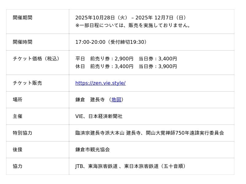 VIE株式会社(神奈川県鎌倉市、代表取締役:今村 泰彦、以下VIE(ヴィー))は、日本経済新聞社(東京都千代田区、代表取締役社長:長谷部 剛、以下日経)と共催で、日本屈指の本格禅道場の一つ、鎌倉「建長寺」にて、「紅葉:秋の風」をテーマにしたプレミアム夜間拝観イベント「ZEN NIGHT WALK KAMAKURA」を10月28日(火)~12月7日(日)の期間開催します。歩くだけで心と脳が“ととのう”、サウンドアート体験がこの秋、紅葉の鎌倉で実現。昨年、京都で3万人超を動員した話題の体験型イベントが、建長寺を舞台に新たな感動を創出します。