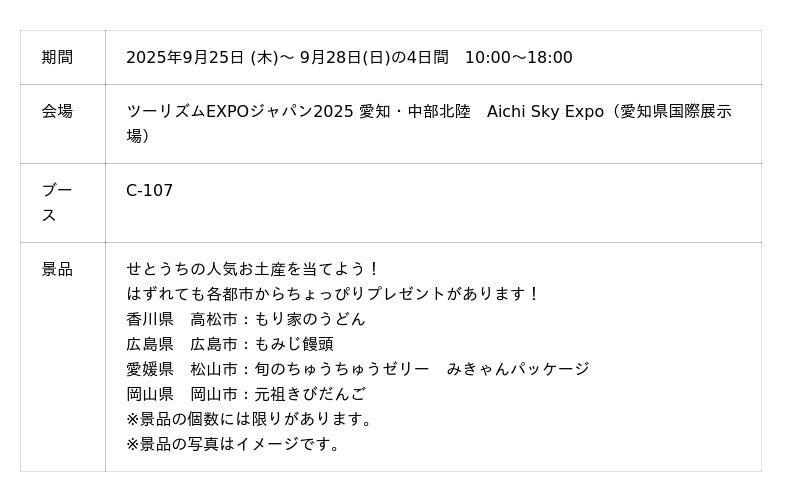 【ツーリズムEXPOジャパン2025愛知・中部北陸 瀬戸内4県都市共同ブースイメージ】