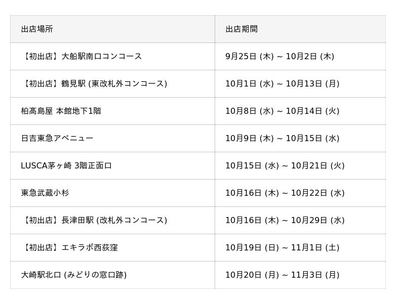 2025年10月度の期間限定店舗として、今回初出店となる大船駅南口コンコース(神奈川県鎌倉市)や、長津田駅改札外コンコース(神奈川県横浜市)、含む東京、神奈川、千葉の計9箇所の百貨店や駅ビル等、各施設の催事場や特設会場へ出店いたします。