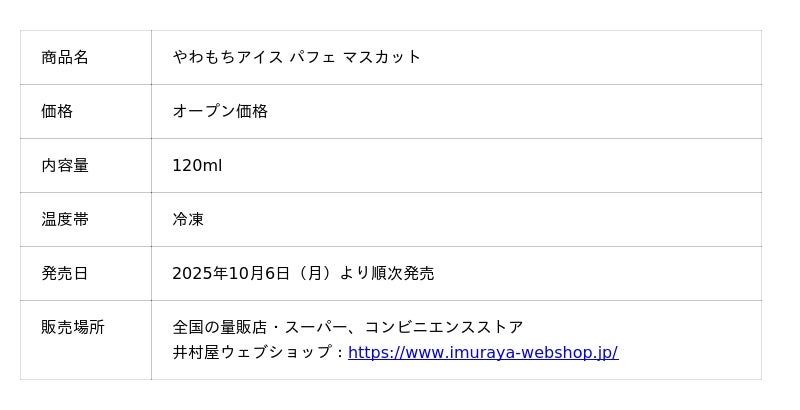 井村屋株式会社(本社:三重県津市高茶屋七丁目1番1号、社長:岩本 康)は、アイスの人気ブランドである「やわもちアイスシリーズ」から、やわもちアイスパフェ第2弾となる新フレーバー『やわもちアイス パフェ マスカット』を2025年10月6日(月)から季節限定で発売します。