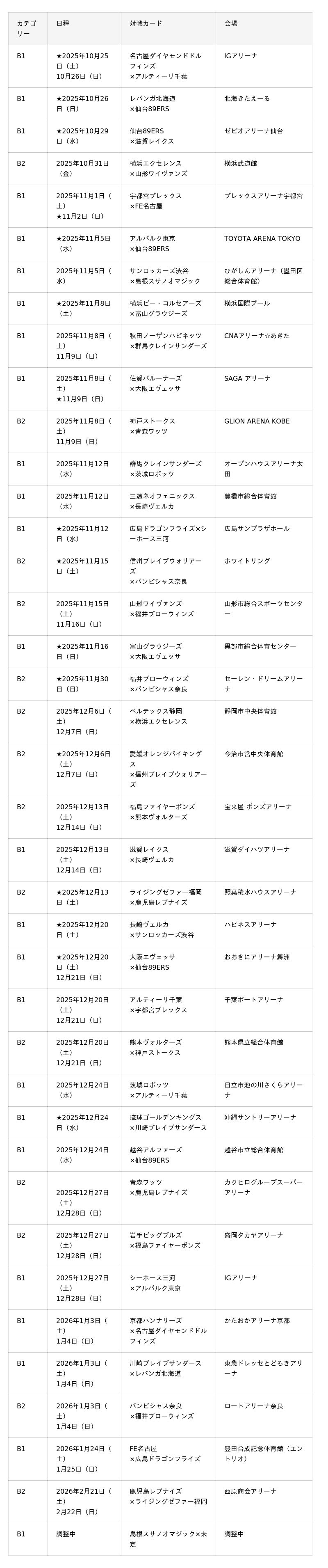 *一部クラブについては日程等、調整中になります。
