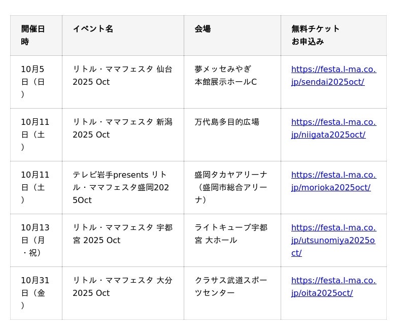 【無料】仙台・新潟・盛岡・宇都宮・大分で人気の親子イベント開催♪秋のおでかけ先は【リトル・ママフェスタ 2025 Oct】へ!