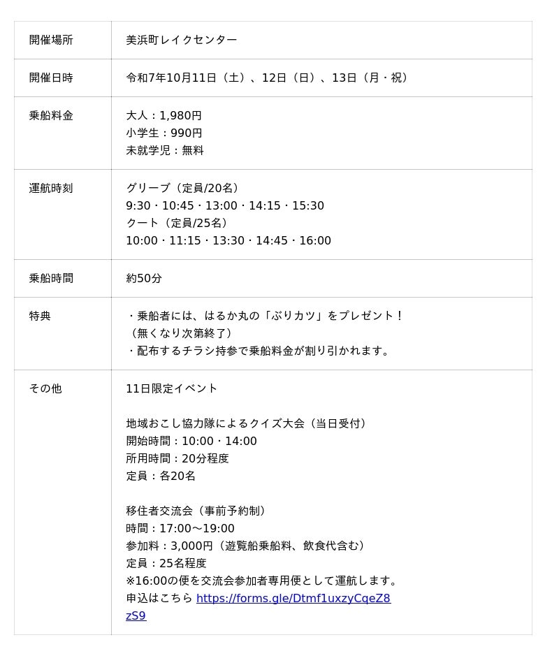 フェスタ初日には、地域おこし協力隊によるクイズ大会や、夜には移住者交流会も開催されます。秋の心地よい湖畔で、特別なひとときをお楽しみください。皆様のお越しを心よりお待ちしております。