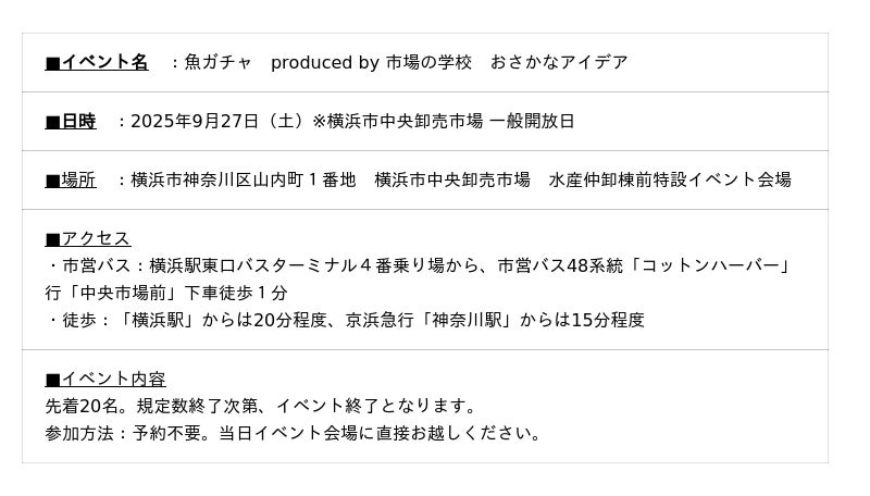 一般社団法人 市場の学校は、2025年9月27日(土)に市場の学校 1stミニイベント「魚ガチャ」を開催いたします。このイベントなどは、次世代へ豊かで美しい海を引き継ぐために、海を介して人と人とがつながる“日本財団「海と日本プロジェクト」”の一環です。