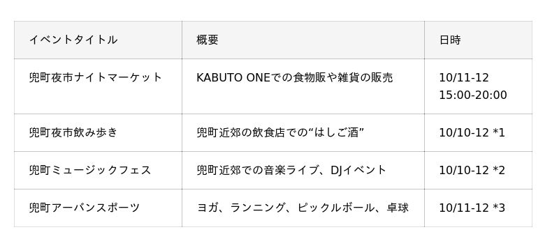 「兜町夜市」は、食、音楽、スポーツ、マーケットなどが同時に行われる街歩きイベントです。期間中は、日本橋兜町エリアにて、ナイトマーケット、音楽イベント、飲み歩き、スポーツイベントを楽しむことができます。「兜町夜市ナイトマーケット」では、アパレル・雑貨・ドリンク・軽食などを取り扱う出店者たちが兜町のランドマーク「KABUTO ONE」の1階アトリウムに集結。さらに、毎年好評の「兜町夜市飲み歩き」「兜町夜市ミュージックフェス」も同時開催します。兜町界隈の個性豊かな飲食店がイベント限定メニューを提供し、専用チケットで“はしご酒” を体験いただけます。また、複数の場所にて様々な音楽ライブやDJイベントが行われ、店舗間を移動しながら街全体で音楽を楽しめます。