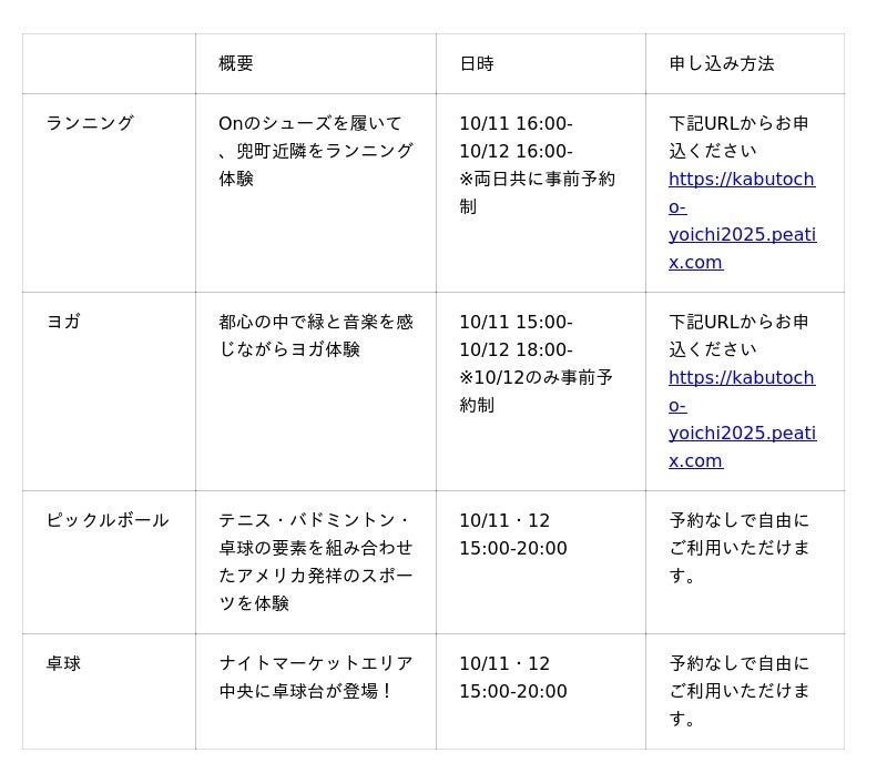 今年は新たに「アーバンスポーツ」をコンセプトに掲げ、都市にいながら楽しめる4つのスポーツ――ランニング・ピックルボール・ヨガ・卓球――を体験できるコンテンツを実施します。体を動かした後は、買い物や飲み歩き、音楽をシームレスに楽しめる新しい「兜町夜市」の形をお届けします。