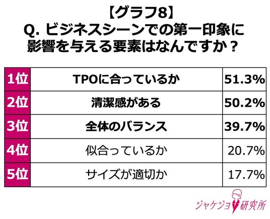 また、ビジネスシーンで初めて会う人の服装が第一印象に与える影響については、「TPOに合っているか」(51.3%)と「清潔感がある」(50.2%)が過半数を占めており、服装そのもののデザインや流行よりも、“場にふさわしいかどうか”と“清潔で整っているか”が、職場における信頼獲得において極めて重要であることが浮き彫りになりました(グラフ8)。 こうした結果は、「何を着るか」よりも「どう見えるか」、すなわち細部の手入れや場に応じた装いであるかどうかが印象形成に直結していることを示しています。特に、新しい環境では、自分らしさの表現よりも“職場での信頼形成”という視点での服装選びが、円滑な人間関係の第一歩となる可能性が高いと言えるでしょう。