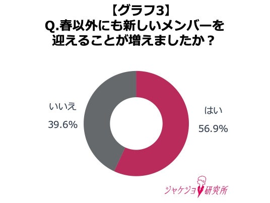■働く女性の約6割が「春以外に新メンバーを迎えた経験あり」と回答「春以外にも新しいメンバーを迎えることが増えたか」という問いに対し、56.9%の女性が「はい」と回答(グラフ3) 。職場のジョブローテーションや採用・異動のタイミングが多様化している実態が浮かび上がりました。かつては「4月=新入社員・新年度スタート」が定番でしたが、近年では通年採用やキャリア採用・転職市場の活発化などにより、春以外のシーズンにも新メンバーを迎える職場が増加していることがわかる結果となりました。