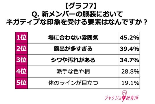 新しいメンバーの服装に対してネガティブな印象を持ってしまう要素としては、「場に合わない雰囲気」(45.2%)、「露出が多すぎる」(39.4%)、「シワや汚れがある」(34.7%)が上位に挙がりました(グラフ7)。