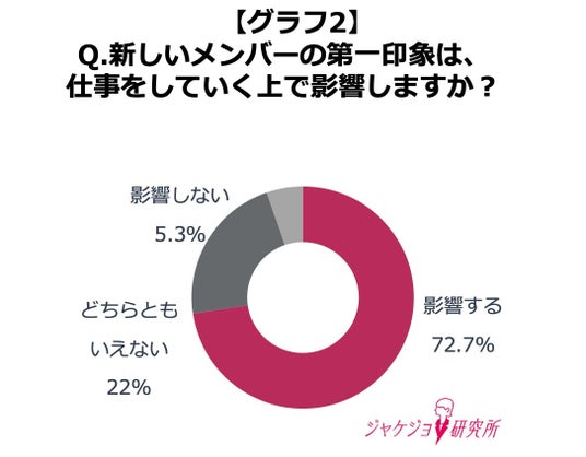 「新しいメンバーの第一印象が良かった時に、『この人は信頼できる』と感じたことがあるか」を尋ねたところ、全体の約8割が「ある」(76.8%)と回答しました(グラフ1)。 この結果から、「第一印象が良い=信頼されやすい」という構図が、実際の職場環境においても広く実感されていることが読み取れます。また、「第一印象は、仕事をしていく上で影響するか」については、約7割の人が「影響する」(72.7%)と回答しました(グラフ2)。このことから、職場において第一印象が業務の円滑なコミュニケーションや信頼関係の構築に影響を及ぼしていることがわかります。