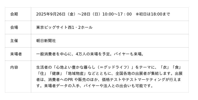 株式会社朝日新聞社(代表取締役社長:角田克)が2025年9月に東京ビッグサイトで主催する消費者向けイベント「GOOD LIFE フェア」に、日本商工会議所(所在地:東京都千代田区丸の内、会頭:小林健)のfeel NIPPON が初出展します。「feel NIPPON」は、全国の小規模事業者等が地域の商工会議所などと連携して行う、地域資源を活用した特産品や観光商品の開発や、その販路拡大などの取り組みを支援する事業です。本社はGOOD LIFE フェアを通じて、各地の中小企業・小規模事業者の販路開拓を後押しします。