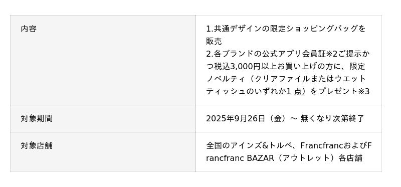 全国※1のアインズ&トルペ、FrancfrancおよびFrancfranc BAZAR(アウトレット)各店舗にて、両ブランド共通デザインの限定ショッピングバッグ(有料紙袋)をご用意するほか、税込3,000円以上お買い上げの方に、限定ノベルティをプレゼントします。この機会にぜひご利用ください。