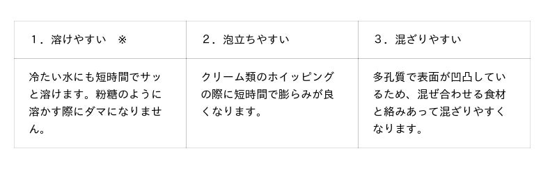 グラニュ糖を原料とした高純度の砂糖のため、グラニュ糖と同じくすっきりとした甘さ。構造上、グラニュ糖などに比べ嵩が大きくなりますが、重量が同じであればグラニュ糖と同じ甘味度です。