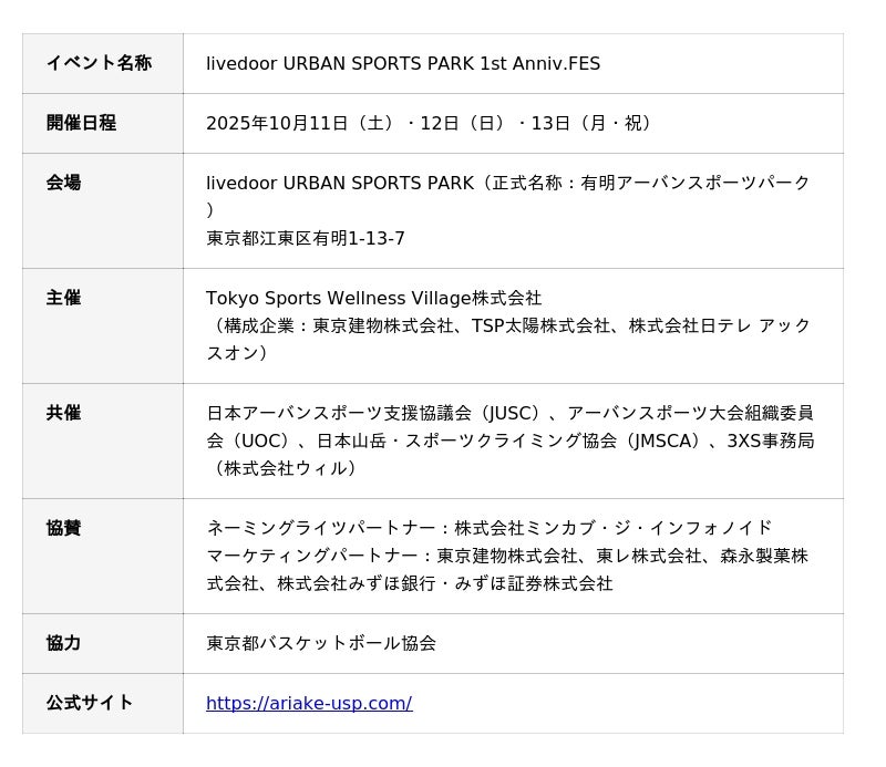 東京建物株式会社を代表企業とし、TSP太陽株式会社、株式会社日テレ アックスオンで構成するコンソーシアムが設立したTokyo Sports Wellness Village株式会社が運営する「livedoor URBAN SPORTS PARK」(東京都江東区有明、以下「本施設」)は、開業から1周年を迎えるにあたり、2025年10月11日(土)~13日(月・祝)の3日間にわたり「livedoor URBAN SPORTS PARK 1st Anniv.FES」(以下「本イベント」)を開催します。