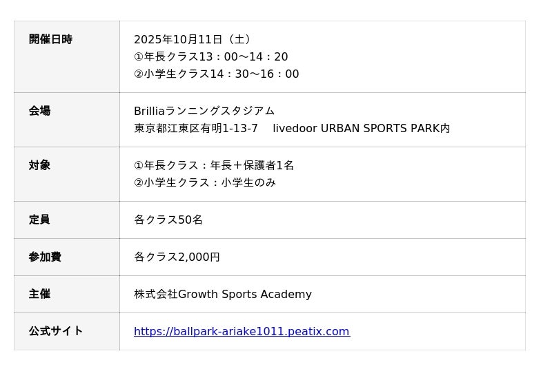 本イベントの開催期間中である10月11日(土)には、併設施設のBrilliaランニングスタジアムにて「GSA(Growth Sports Academy)ボールパークスポーツ体験会」を実施します。ラグビー元日本代表・斉藤祐也氏と世界陸上銀メダリスト・市橋有里氏による指導のもとラグビーやランニングを学ぶことができます。詳細はイベント公式サイトをご参照ください。