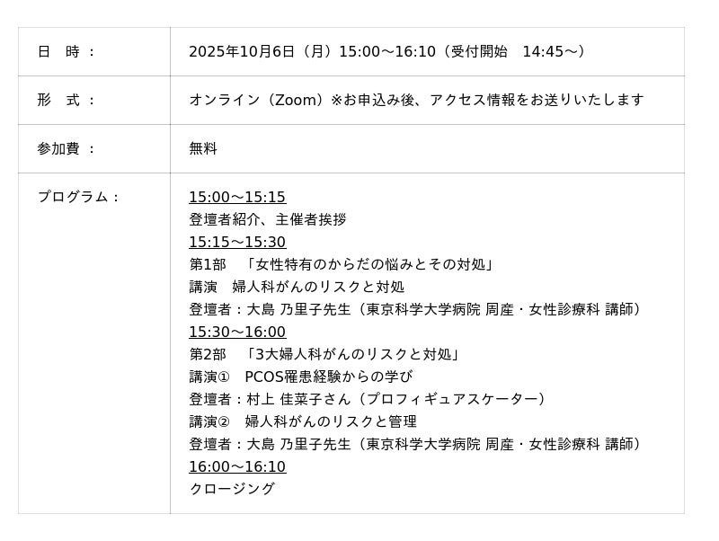 女性特有の体の不調や対処法が知りたい、婦人科がんのリスクが気になる等、ご関心のある方はぜひご参加ください。