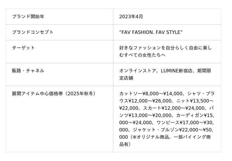 “FAV FASHION. FAV STYLE”をコンセプトに、好きなファッションを自分らしく自由に楽しむすべての女性たちへ向けて、枠にとらわれないスタイルを提案します。