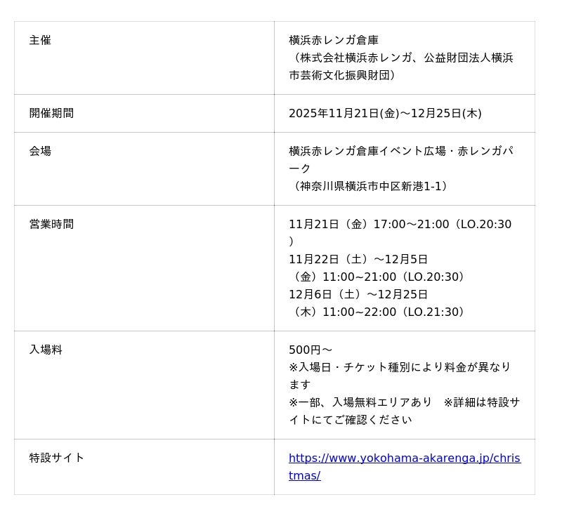 「Christmas Market in 横浜赤レンガ倉庫」については、本日、株式会社横浜赤レンガより発信のニュースリリースをご確認ください。