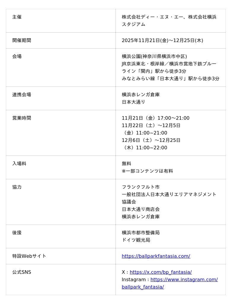 「BALLPARK Xmas YOKOHAMA KANNAI 2025」は、横浜市共催のKAN-KAN SQUARE PROJECT 2025の一環として実施します。横浜市国際局の協力により、横浜市とパートナー都市であり、世界最古のクリスマスマーケットを有するともいわれるフランクフルト市に本イベントに協力いただくこととなりました。