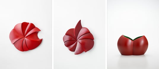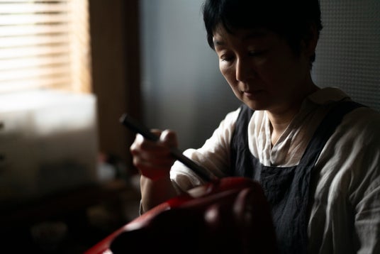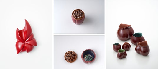 笹井氏は、乾漆技法による造形に朱漆などの色漆を施す塗立仕上げを中心に作品を制作。果実や草花、着物の重ねや結び、雲や太陽など、自然や文化的モチーフから着想を得ている。鮮やかな色彩と柔らかな稜線が織りなす作品は、愛らしさと堂々たる存在感を併せ持ち、生命の喜びを鮮烈に表現する。伝統技法への深い共感を基盤に、現代的な視点を重ね合わせることで、独自の漆芸世界を切り拓いている。