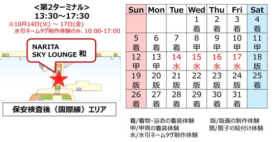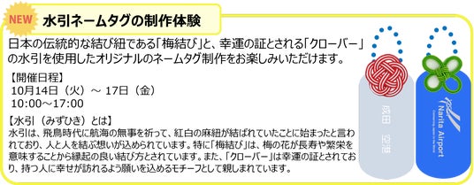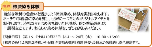 10月は、株式会社JALサンライトご協力のもと、日本の伝統的な装飾紐である水引を使用したオリジナルネームタグの制作体験を実施いたします。また、渋柿から生まれる伝統の染色技法「柿渋染め体験」も実施いたしますのでぜひお楽しみください。