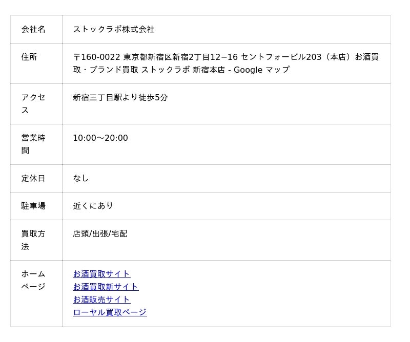 お酒買取専門店ストックラボのサントリーローヤル買取の特徴を3つに分けて解説します。まずは、ストックラボの業者の概要をご確認ください。