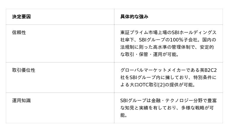 当社は、既存事業で培った知見を活かし、電力の観点からビットコインのエコシステム全体への貢献を目指した取り組みを推進しております。暗号資産の取引・運用・管理体制の強化を目指し、このたび新たにSBI VCトレードとの連携を開始いたしました。SBIグループとの強固な関係性を背景に、安定的な取引・安全性の高い保管・戦略的な運用に至る盤石な体制を構築してまいります。