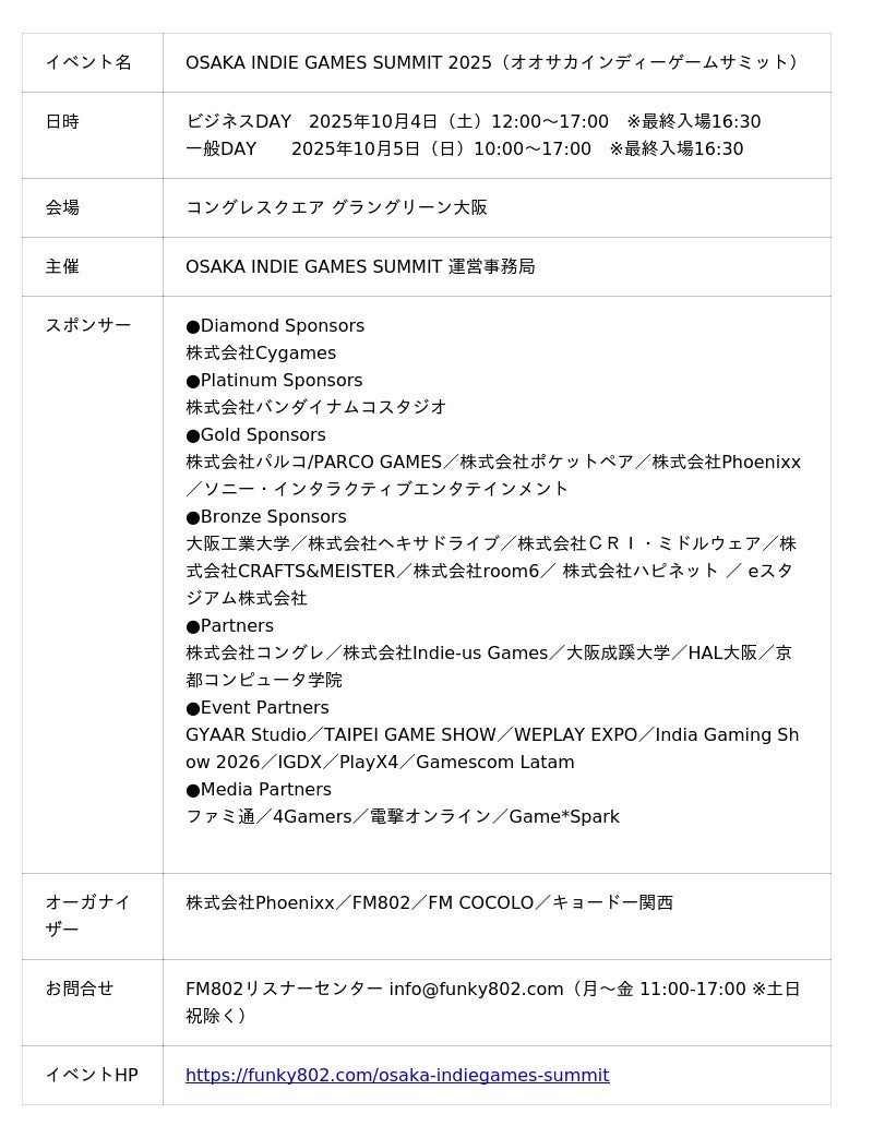株式会社Phoenixx(フィーニックス)(東京都武蔵野市、代表取締役社長:坂本 和則)は、『OSAKA INDIE GAMES SUMMIT』のSteamページ公開、クリエイター出展ブース番号公開、及びステージコンテンツについてお知らせいたします。