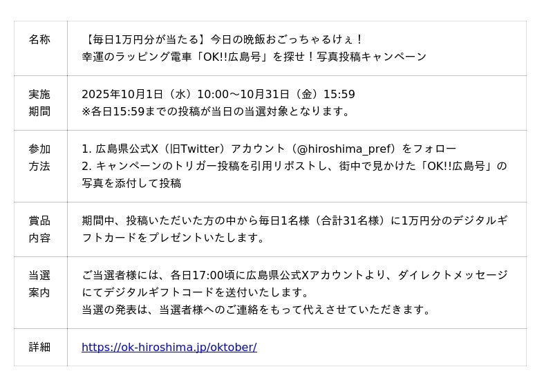 幸運のラッピング電車「OK!!広島号」を探せ!写真投稿キャンペーン2025年10月1日(水)~31日(金)の期間中、「OK!!広島号」の写真をSNSに投稿いただいた方の中から、毎日1名様に1万円分のデジタルギフトカードをプレゼントする、写真投稿キャンペーンを実施いたします。